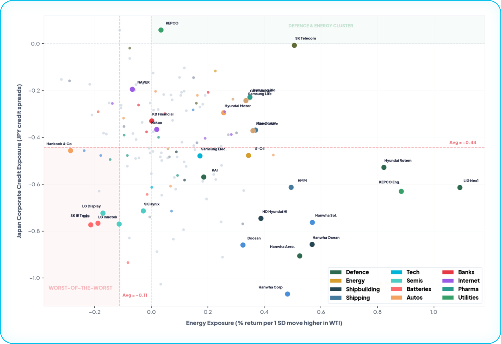 X-axis = Energy (WTI) exposure. Y-axis = Japan Corporate Credit (JPY credit spreads) exposure. Red dashed lines = average negative exposure thresholds. Only 1 name (KEPCO) sits in the top-right with positive Credit exposure.