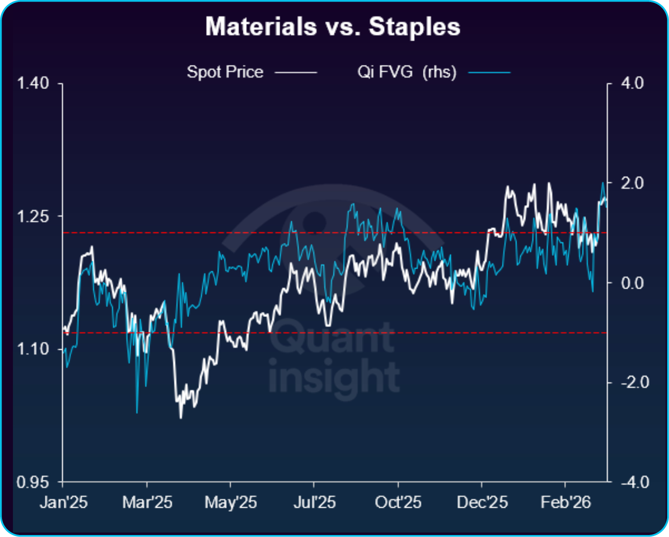 Qi shows Materials outperform on higher energy, a stronger Dollar, a hawkish Fed that bear flattens the yield curve. All that has transpired but Materials have overshot & now screen as 1.5 sigma (4.6%) rich to Consumer Staples. That’s towards the top end of recent FVG ranges, & recent correlations point to the “right” kind of mean reversion.
